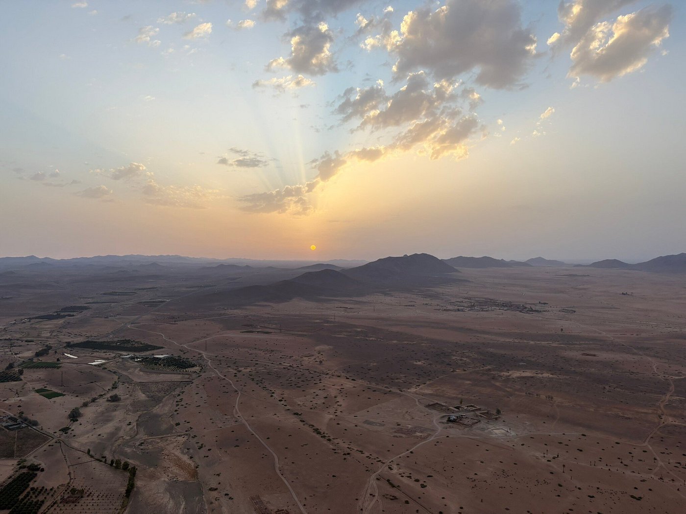 Dès votre arrivée, profitez d’un accueil raffiné avec thé marocain, café et pâtisseries. Puis, envolez-vous au lever du soleil pour admirer des panoramas spectaculaires : les douars traditionnels, les montagnes des Jbilets, la vallée de l’Oued Tensift et, selon les conditions, la majestueuse chaîne de l’Atlas.